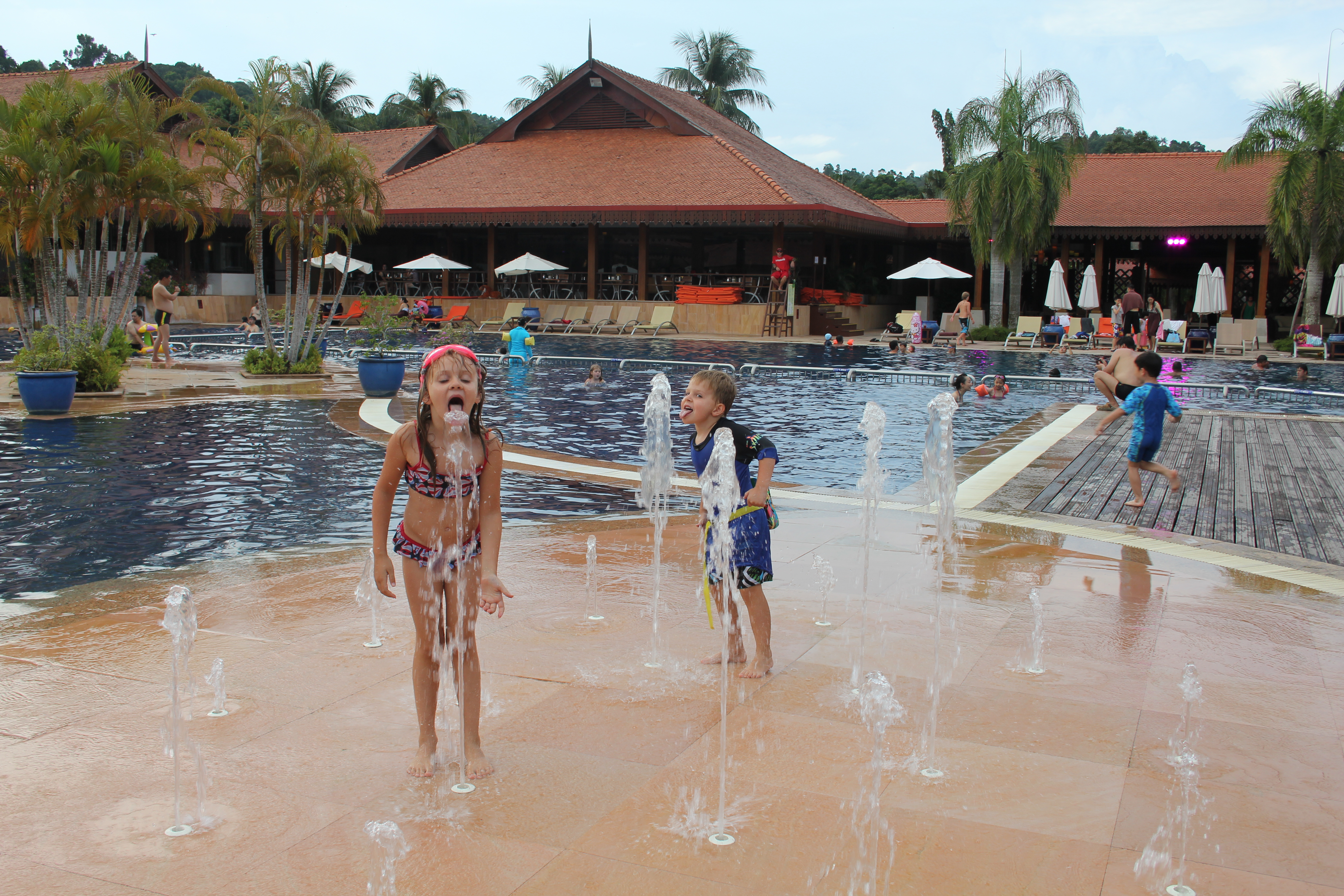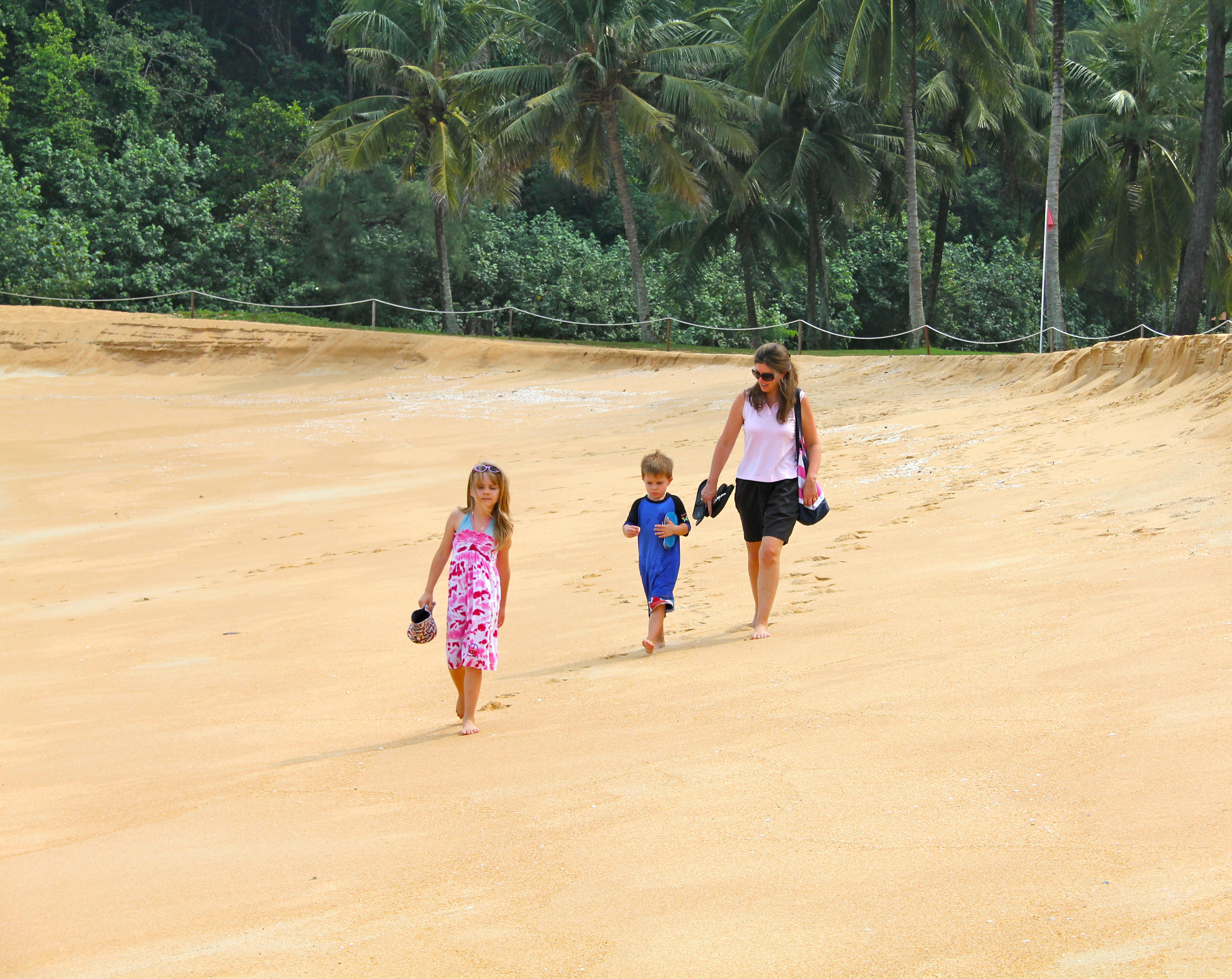After our short flight to Kuantan in Malaysia, we were the only flight to go through customs and immigration – it is a tiny airport!  We had a little delay with the transport to Club Med at Cherating Beach, (we were just about to take a taxi, but then the transport arrived!)  When we arrived we were greeted by several people waiting for us in a welcome party!  On the 40 minute drive from the airport, I was amazed to see cows in front gardens, like you would see dogs anywhere else.  We saw monitor lizards and monkeys on the driveway up to reception.  75% of the resort is jungle and so we have been warned about keeping doors and windows locked to keep monkeys out (apparently it is not enough to just keep them shut, the monkeys have worked out how to open unlocked doors and windows!)  We have connecting rooms in a building on stilts (built in local style)  so better sleeping accommodation than at Sentosa Island.  The resort is built on unspoilt coastline and we walked along the beach once we checked in.  There was no-one else on the beach and the kids found some wonderful shells.