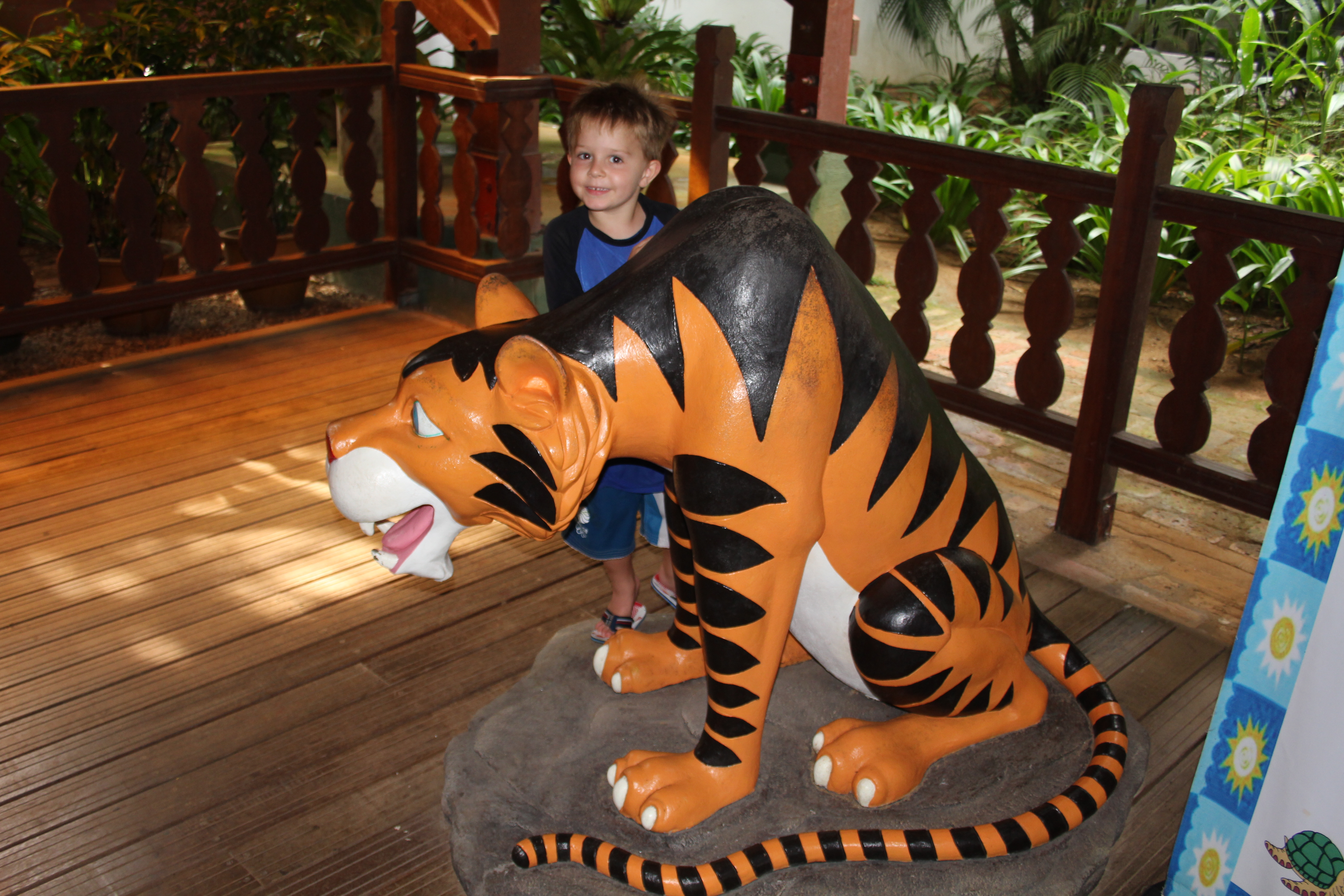 There were tigers everywhere to scare the monkeys! Cuddly ones as well as statues. We saw the staff use the cuddly ones to get the monkeys away from people – very effective!