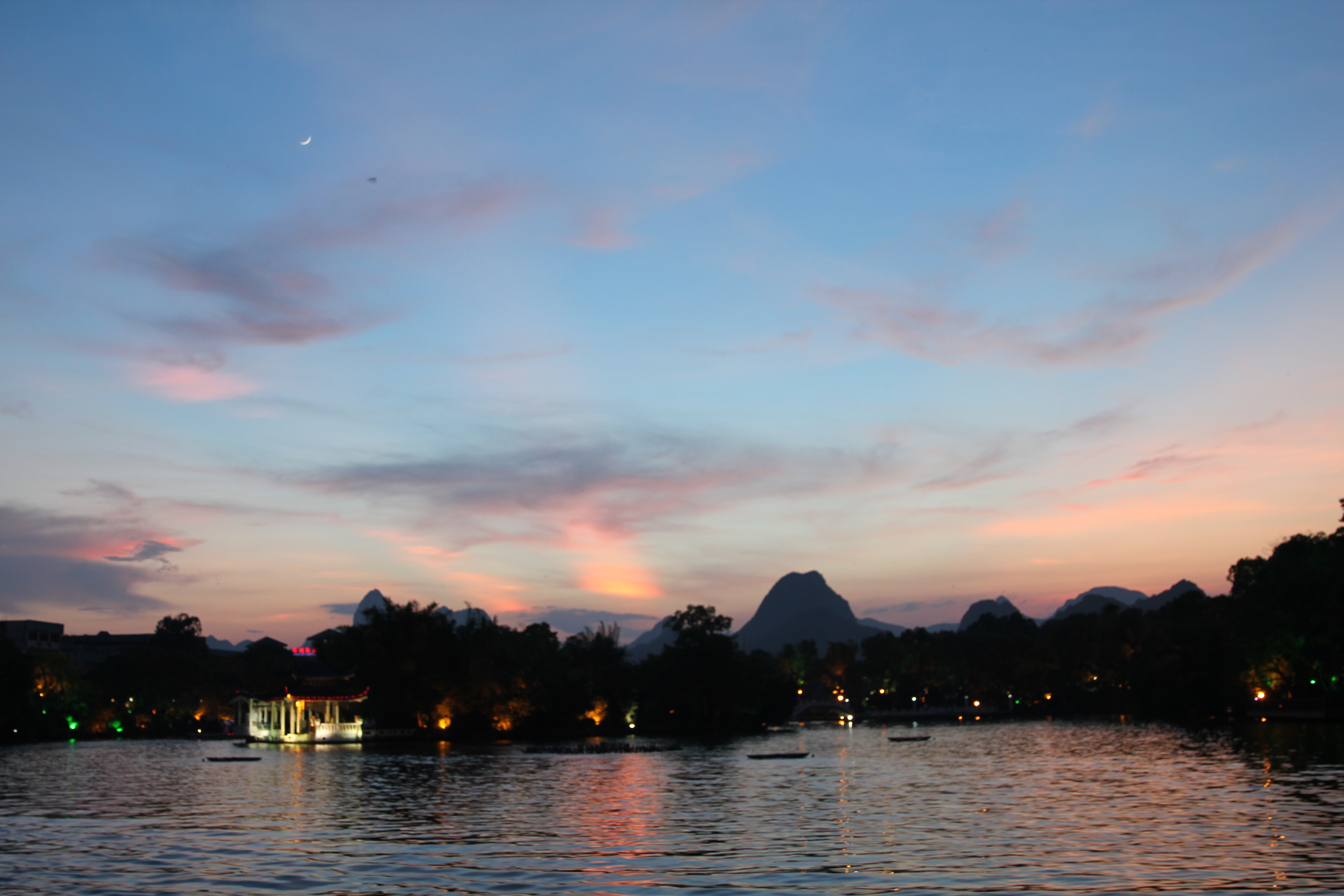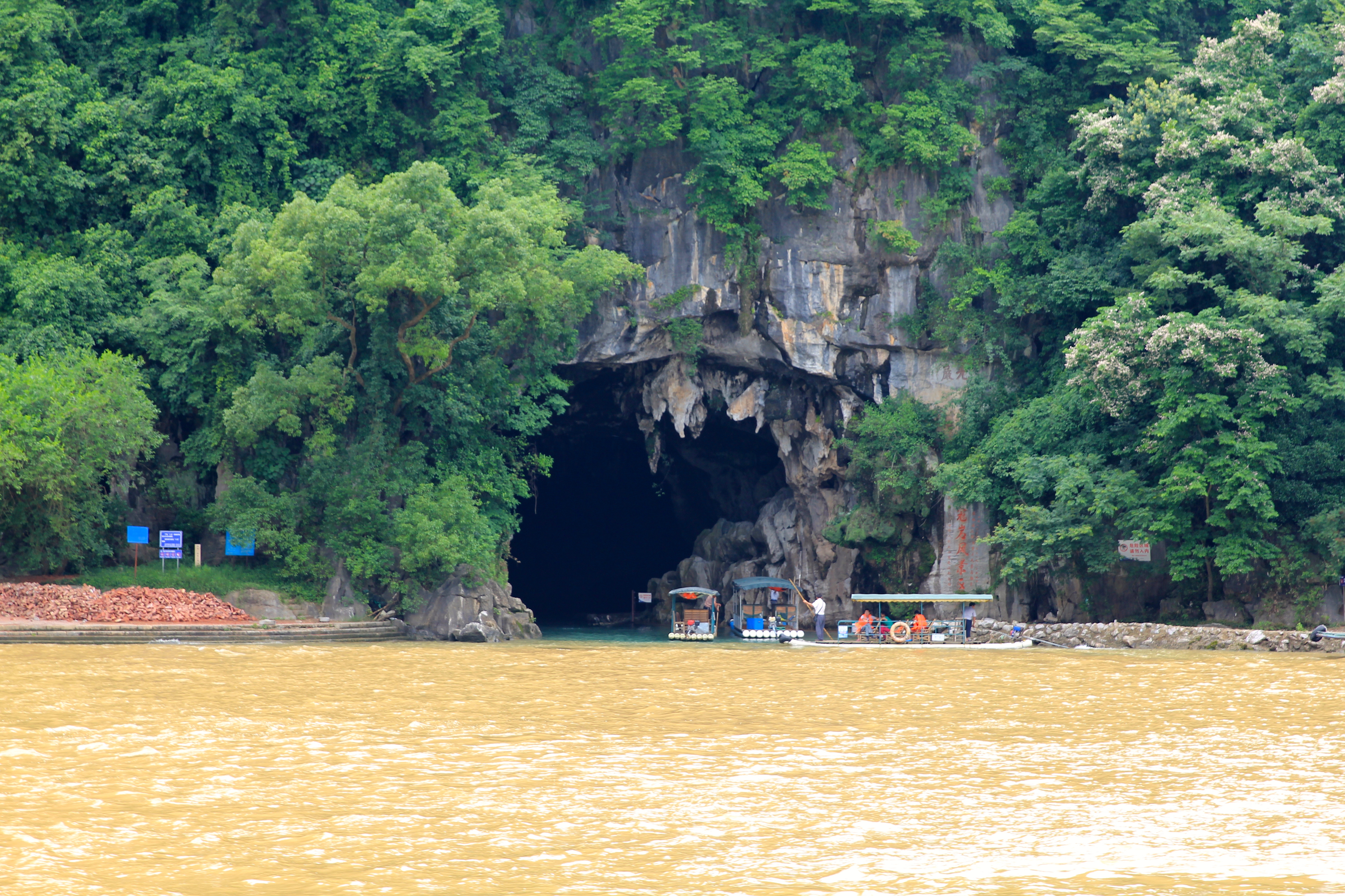 In the second section, which is from Ox Gorge (near the Bamboo River Dock and the Millstone Dock) to Water-Dropping Village, we witnessed the most charming scenery of the cruise: Wangfu Rock (Yearning-for-Husband’s-Return Rock); Crown Cave – A crown-like crag earns the hill this name. What makes the hill a worthy stop for both river cruise tourists and those who arrive from Guilin City by bus tour, is its twelve kilometer long water-eroded cave. It is a wonderland of various stalactite, stone pillars and rock formations in the cave. Since it is open to tourists in 1995, illuminating lights, sound control tour guide system and escalators are equipped in the scenic area and sightseeing cars and boats enable visitors to tour inside the cave. The government plan to build this site as an all-round tourist area including cave visiting, country sightseeing and ethnic minority exploration. It is estimated to become an important excursion site along the the river. Not very far from the Crown Cave on the western bank, a huge rock descends into the river and cuts off a footpath by the water edge. Villagers have to take a ferry to reach the other side and continue the way. So, this spot gets its name Half-Side Ferry (for usually ferry means to transport people by boat across a body of water and reach the opposite bank).