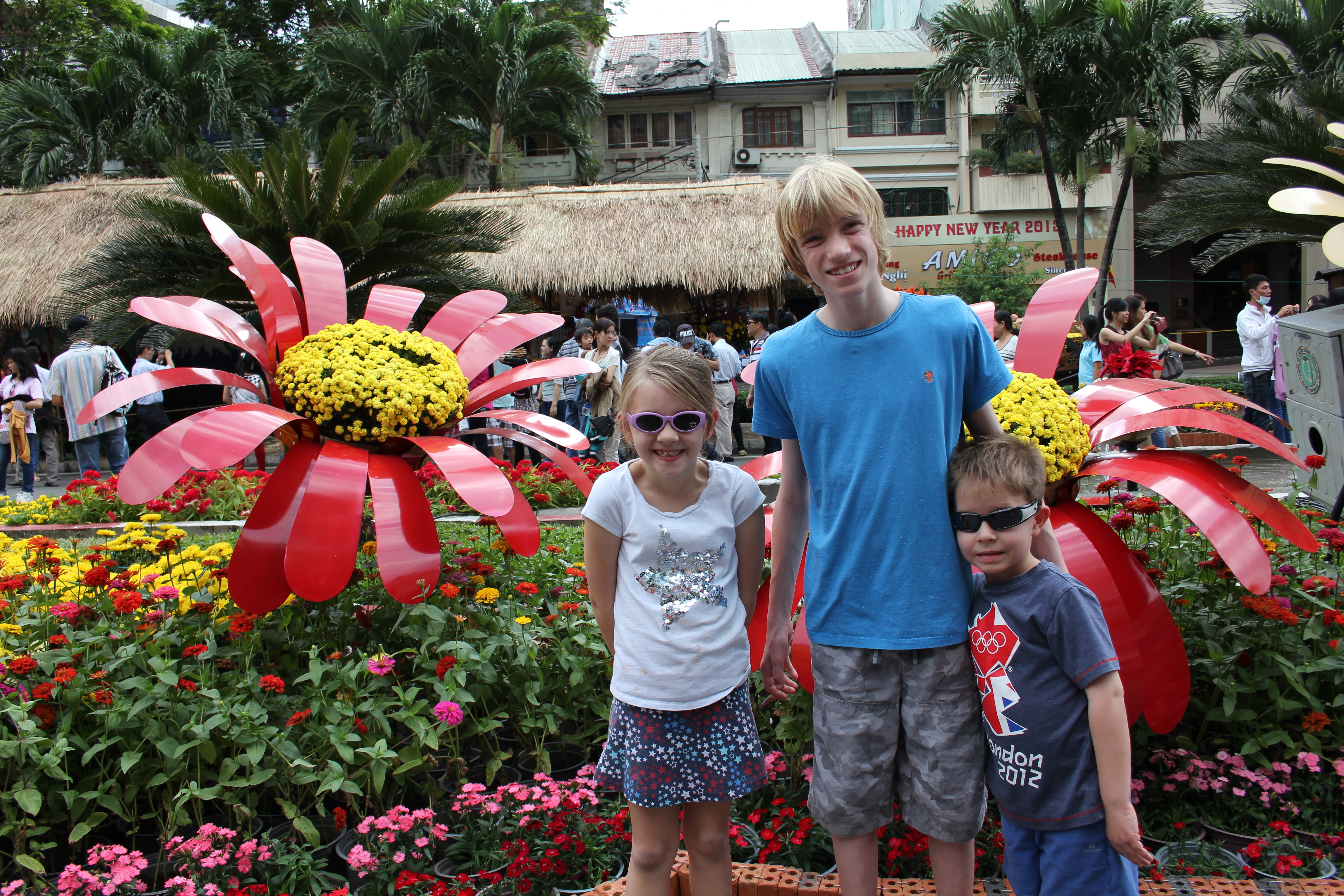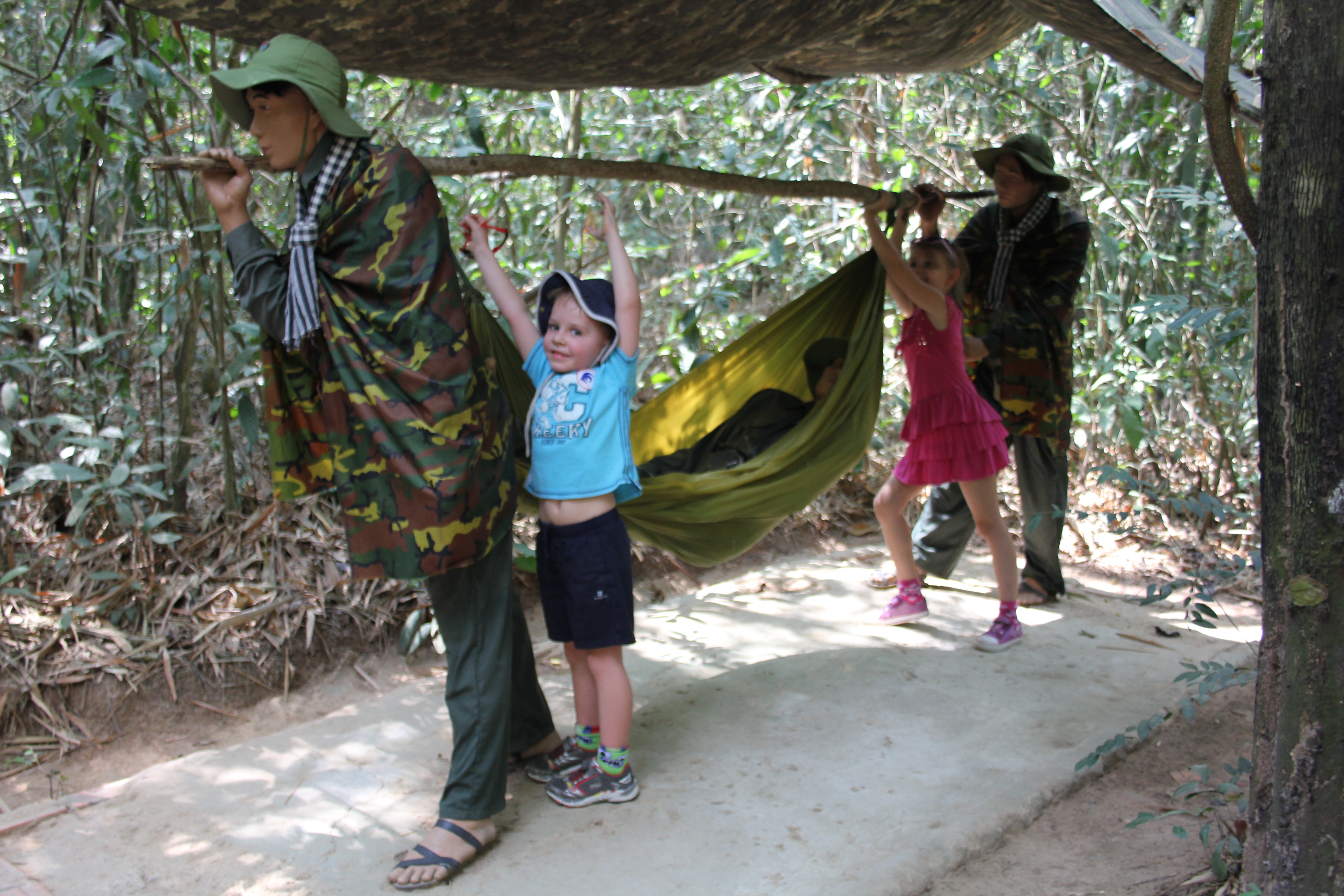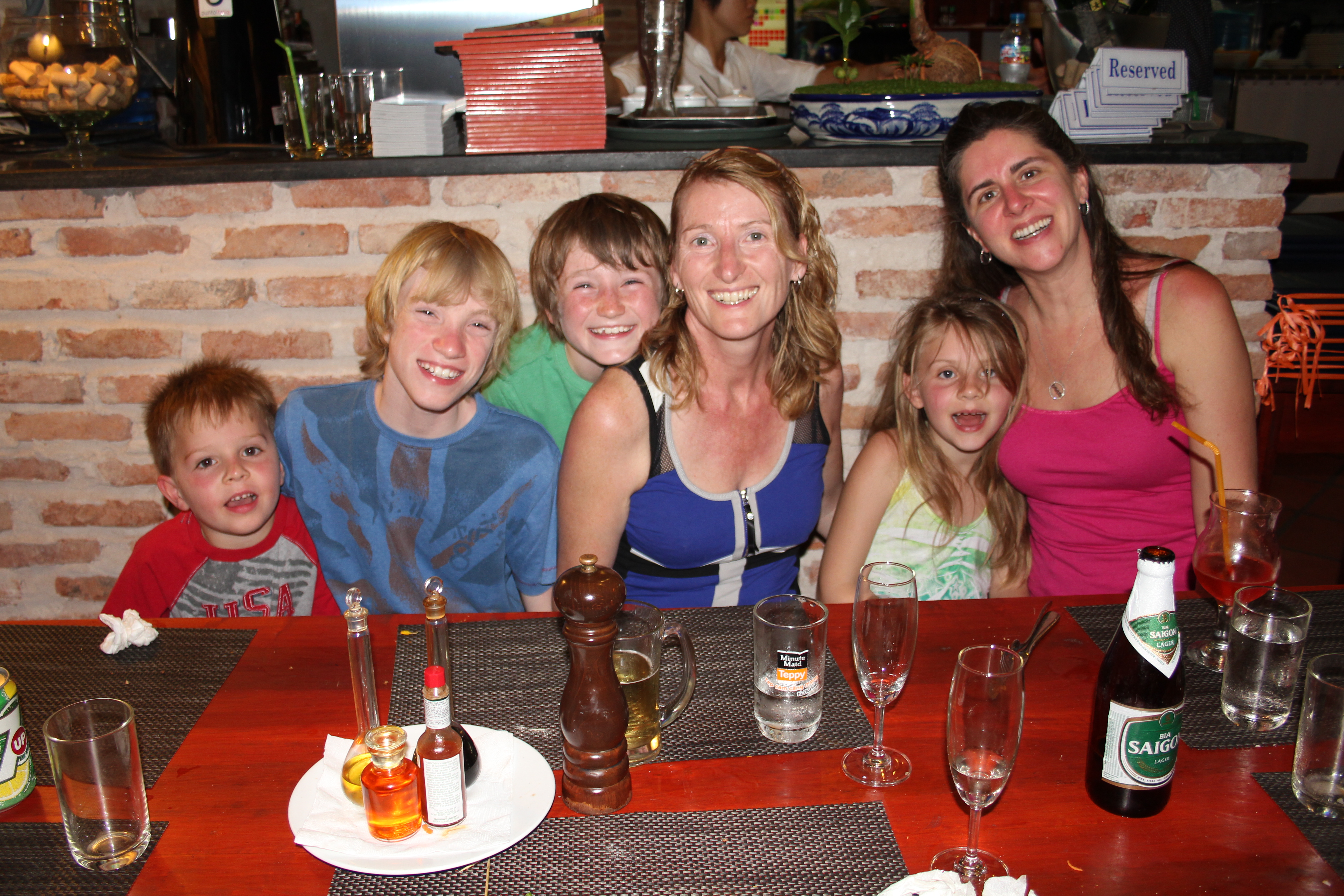 After this, we walked back to meet our driver who took us to another part of the River for Bamboo river ride. This was a huge highlight for the whole family! They are floating bamboo rafts that hold 2 people. Owen and Isabelle were in 1 and Oliver and I in another. We bought some water pistols and had LOADS of fun drenching everybody. We also got soaked as a result of the payback. Both of our guides stopped to get us beers – which were being kept cool in the river!!